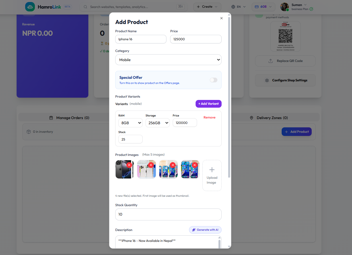 With HamroLink, you can turn your business into a fully working online store — with product listings, FonePay QR payments, automatic order tracking, and delivery zones — in under 30 minutes. No coding. No developer. No expensive monthly fees.