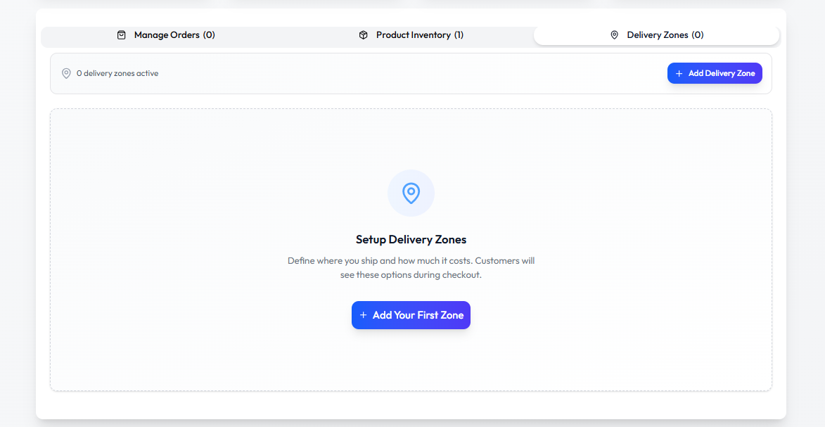 No delivery zones configured Without zones, the checkout delivery step is empty and purchases cannot be completed. Add at least one zone before launching.