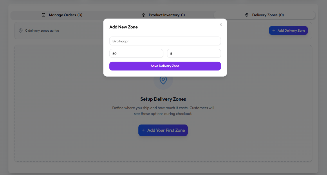 - Delivery Zone selection (prices from your Step 15 setup appear here)