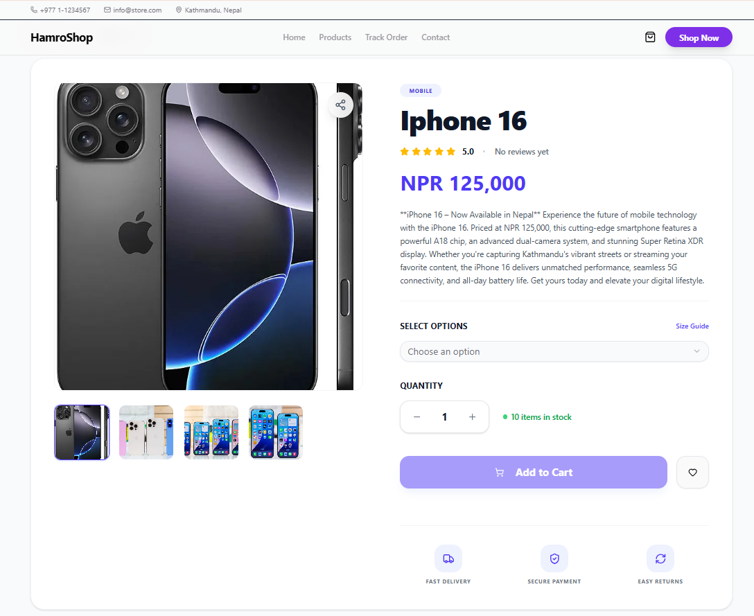- Trust badges: Fast Delivery, Secure Payment, Easy Returns