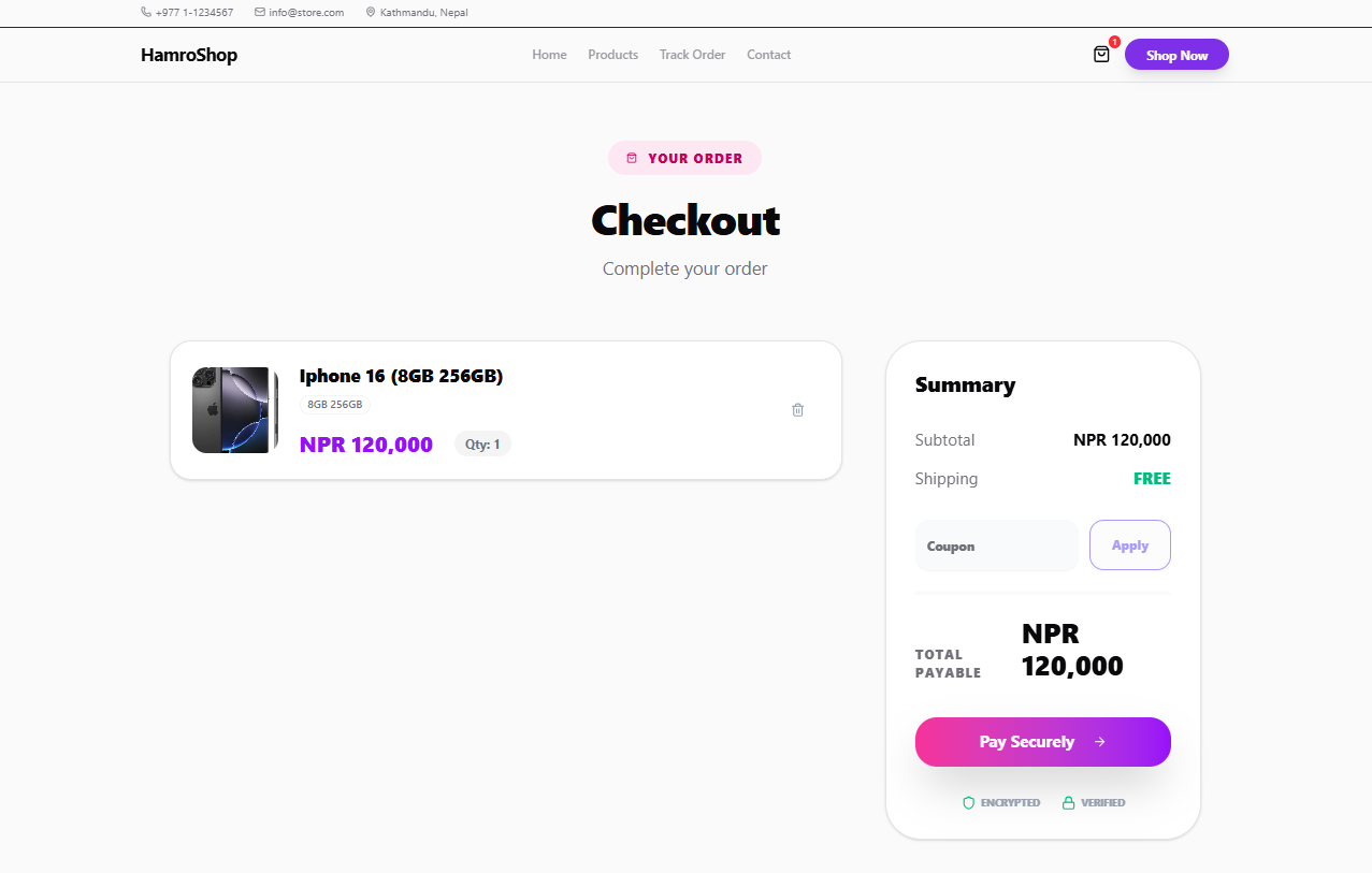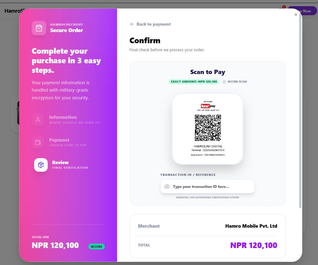 "Pay Securely" opens HamroCheckout, a 3-step checkout modal with military-grade encryption.