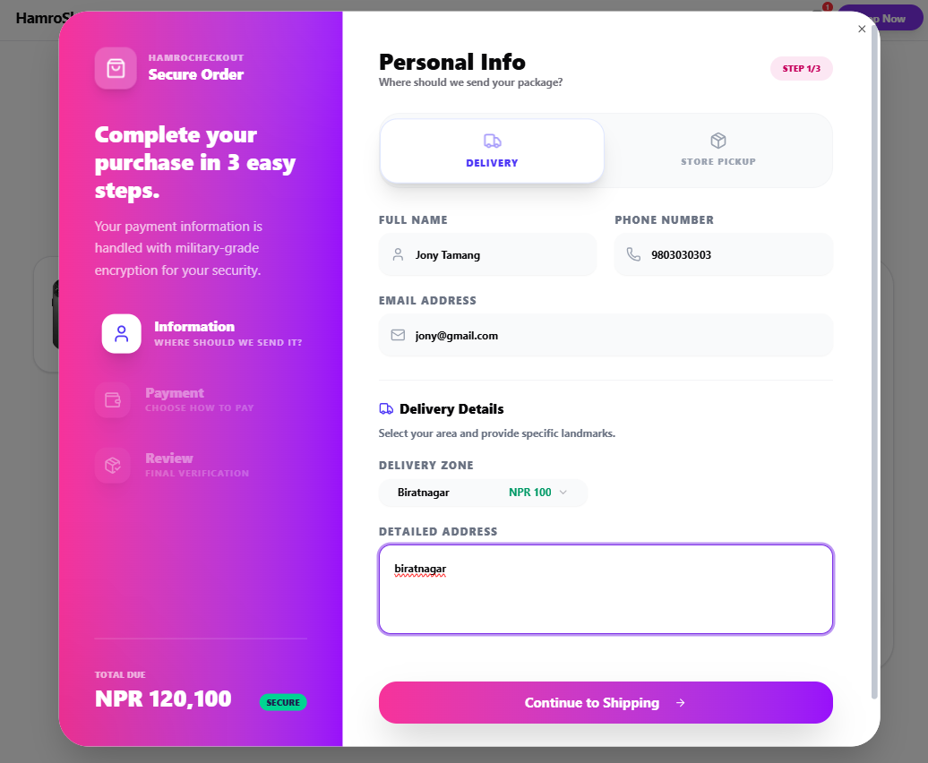 Step 19: HamroCheckout — Customer Fills Personal Info