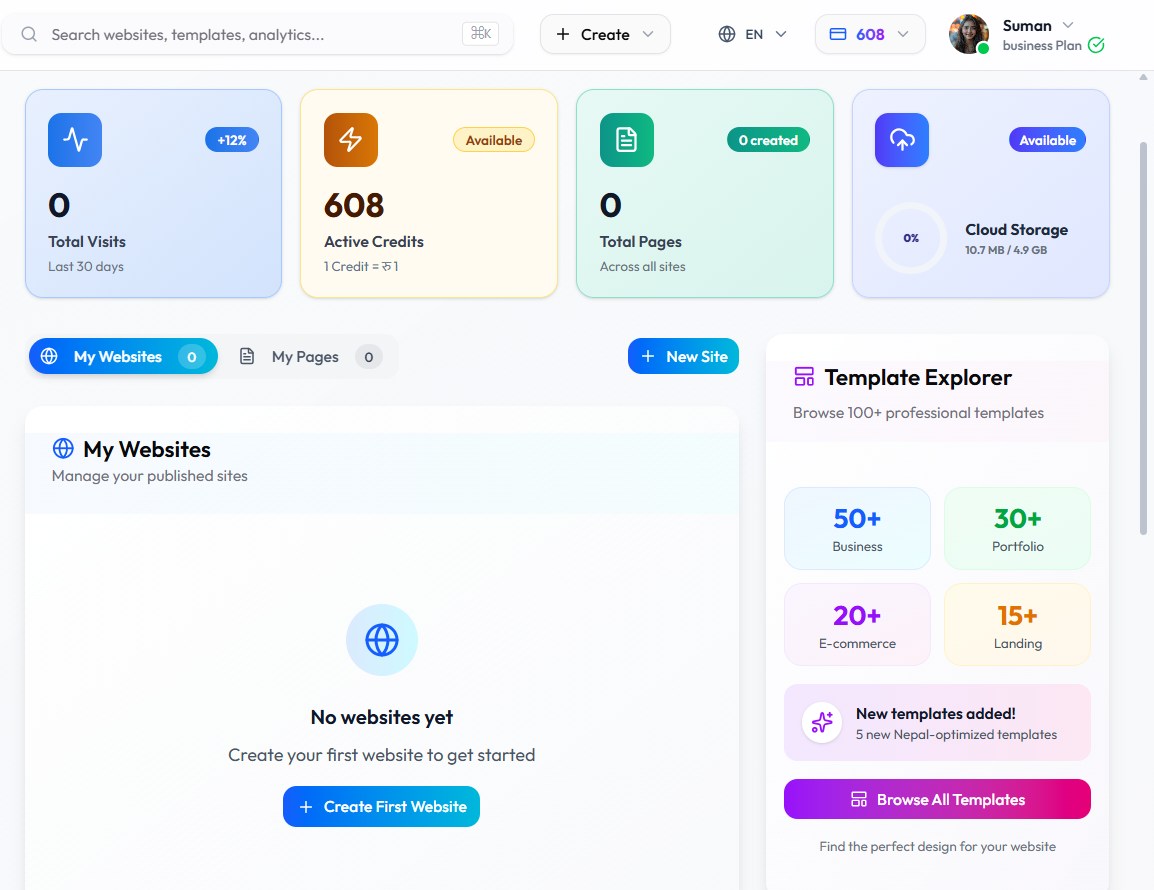 On the right, Template Explorer shows 100+ professional templates — including 20+ e-commerce templates designed specifically for Nepal businesses.