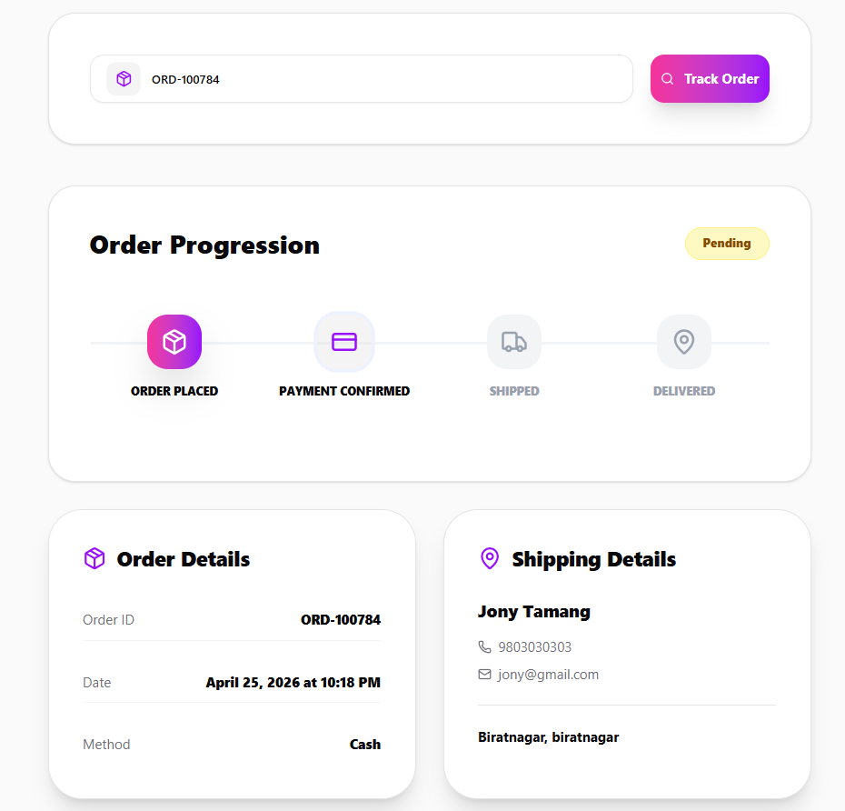 Plus full order details: ID, date, payment method, name, phone, email, and delivery address. This page alone eliminates most "where is my order?" messages as your volume grows.