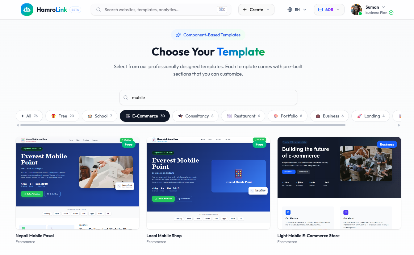 Which HamroLink template is best for an online shop in Nepal? For a general product store, choose any template under the E-Commerce tab. For mobile shops, use "Nepali Mobile Pasal." For clothing, use fashion templates. All templates include a working checkout system, product pages, and QR payment support out of the box.