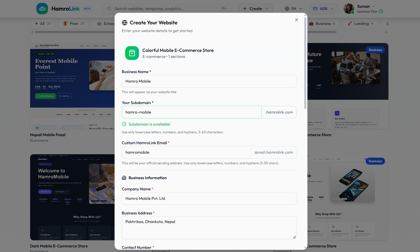 HamroLink checks your subdomain in real time. Green "Subdomain is available!" means you can use it. If it is taken, try adding your location — e.g., hamromobile-dhankuta.