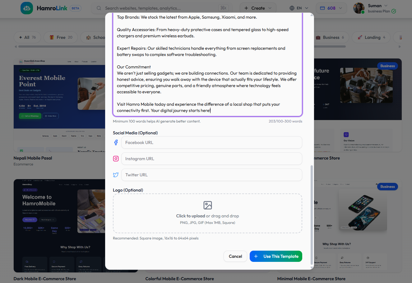 After clicking a template, a "Create Your Website" form opens. Fill it carefully — HamroLink's AI uses this information to auto-generate content for your pages.