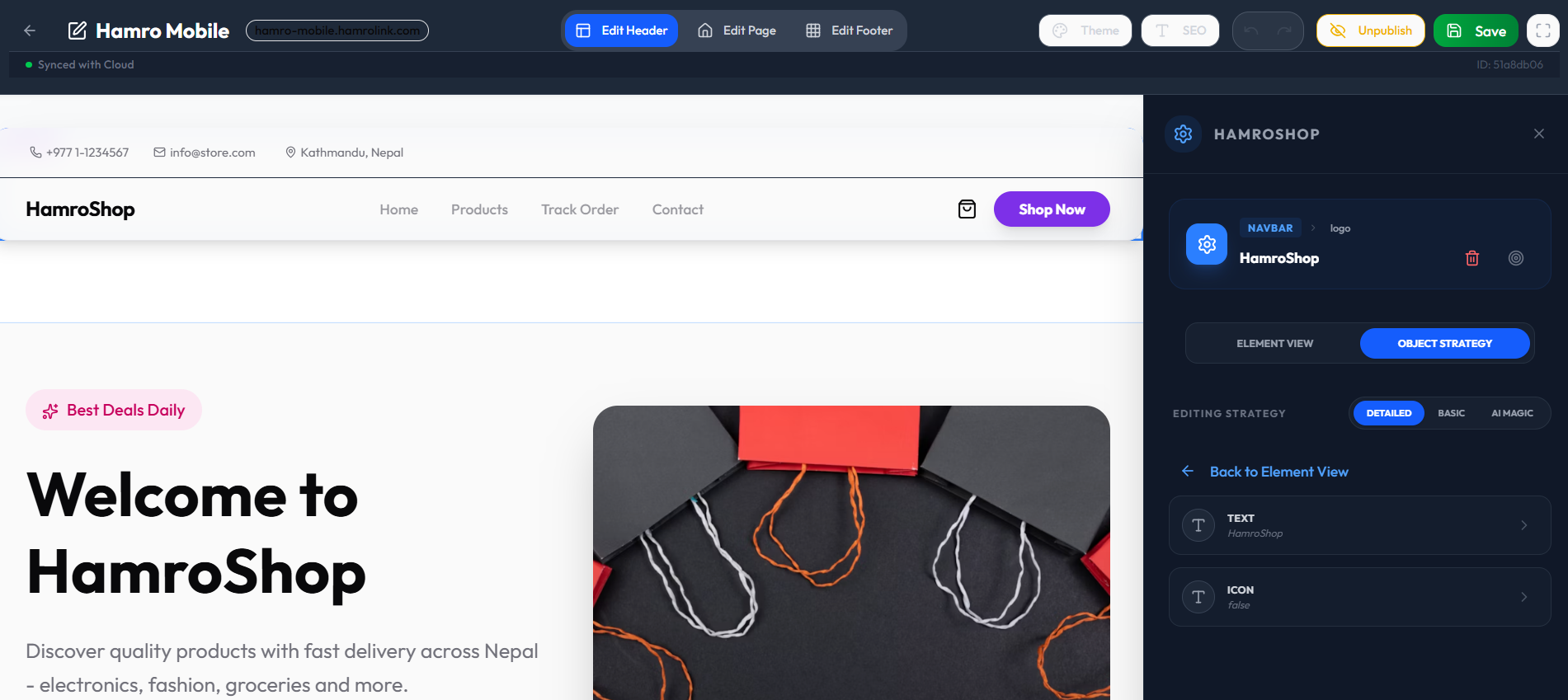 Click Edit Header. In the right panel, click the "HamroShop" text under the NAVBAR section and type your actual store name. The right panel offers two views: Element View (edit individual items) and Object Strategy (AI-assisted editing strategy).