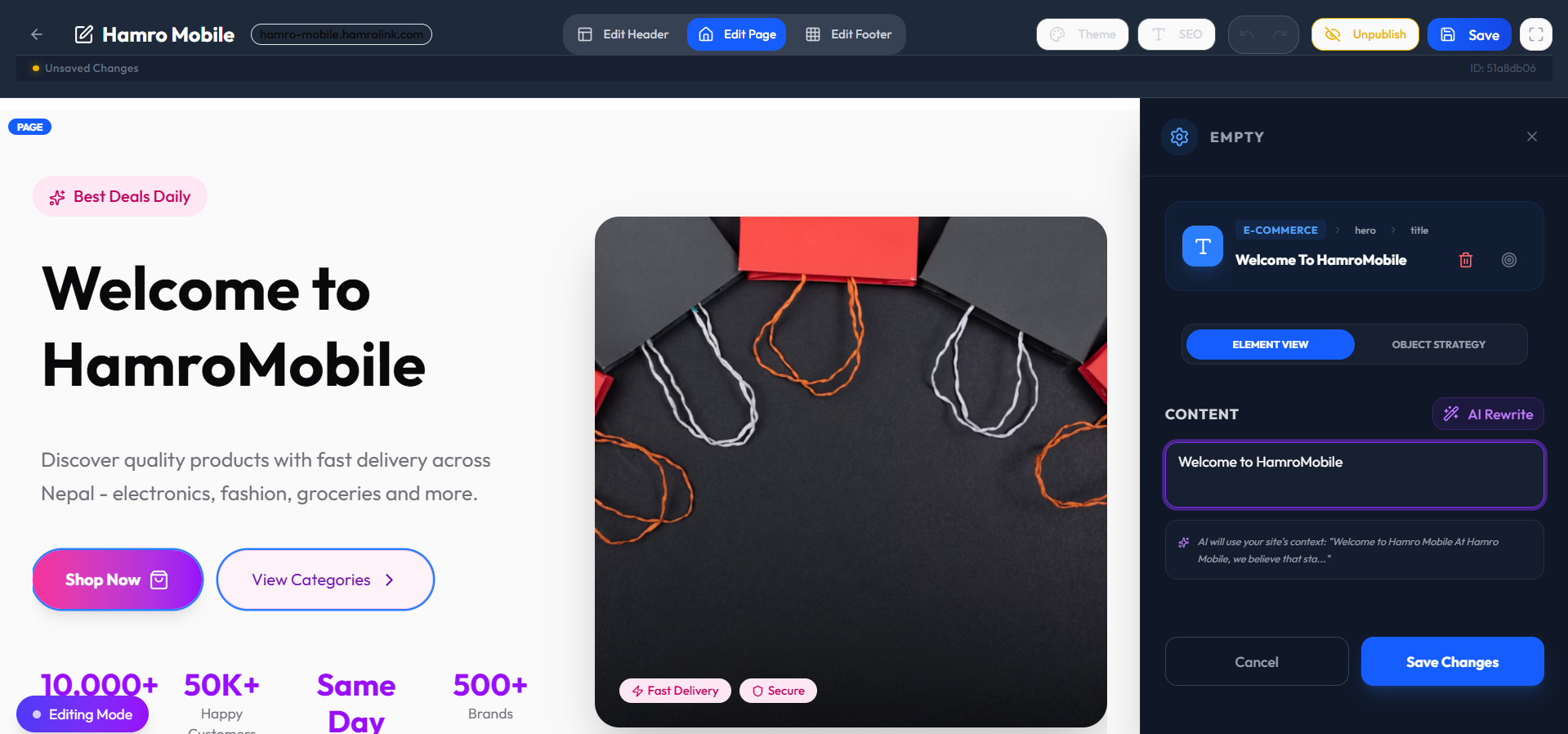 HamroLink opens your new store in the Visual Editor. Everything you see on screen is clickable and editable.