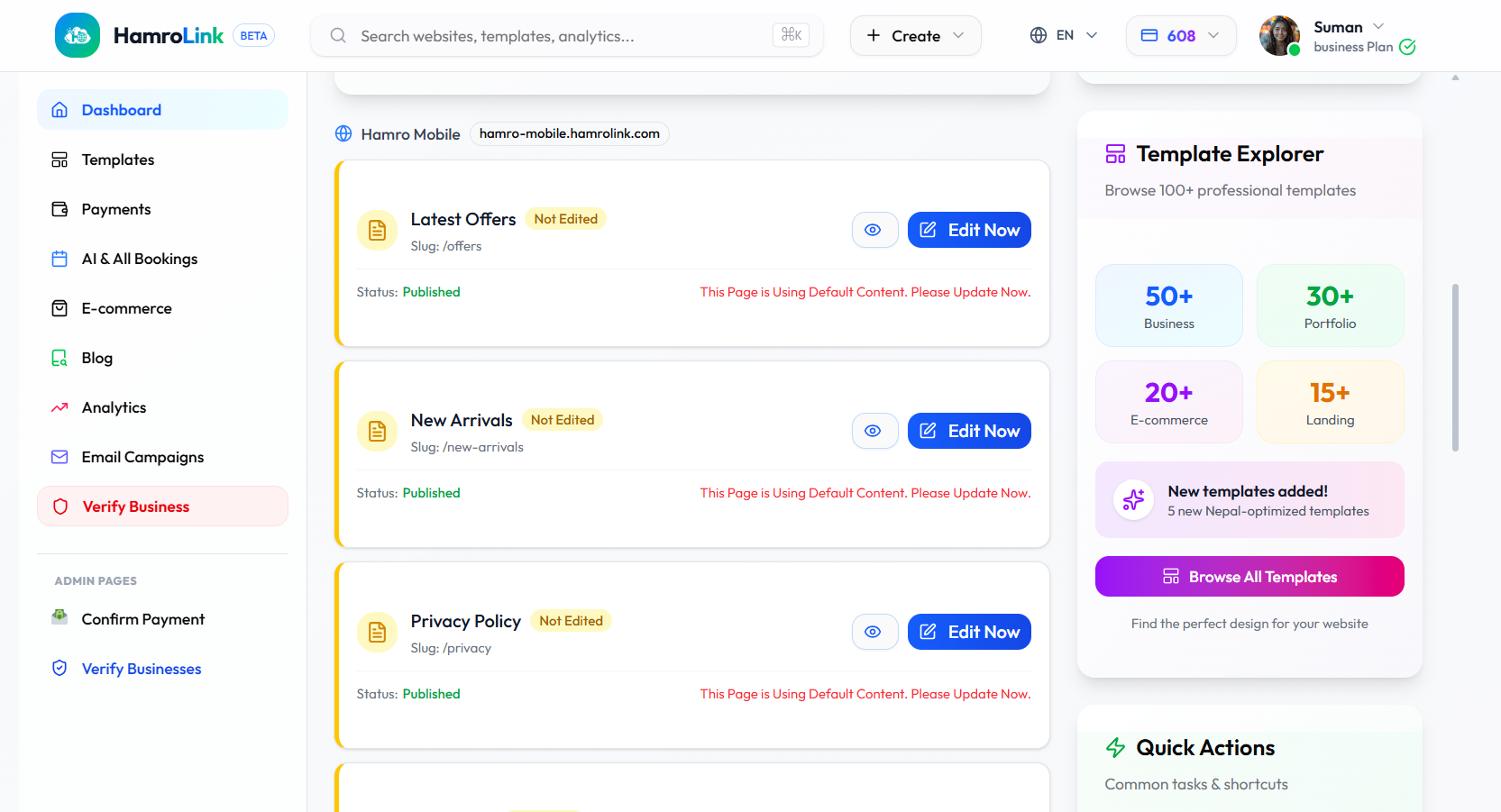 Go back to the HamroLink Dashboard, click your website name, and scroll to see all pages created automatically.