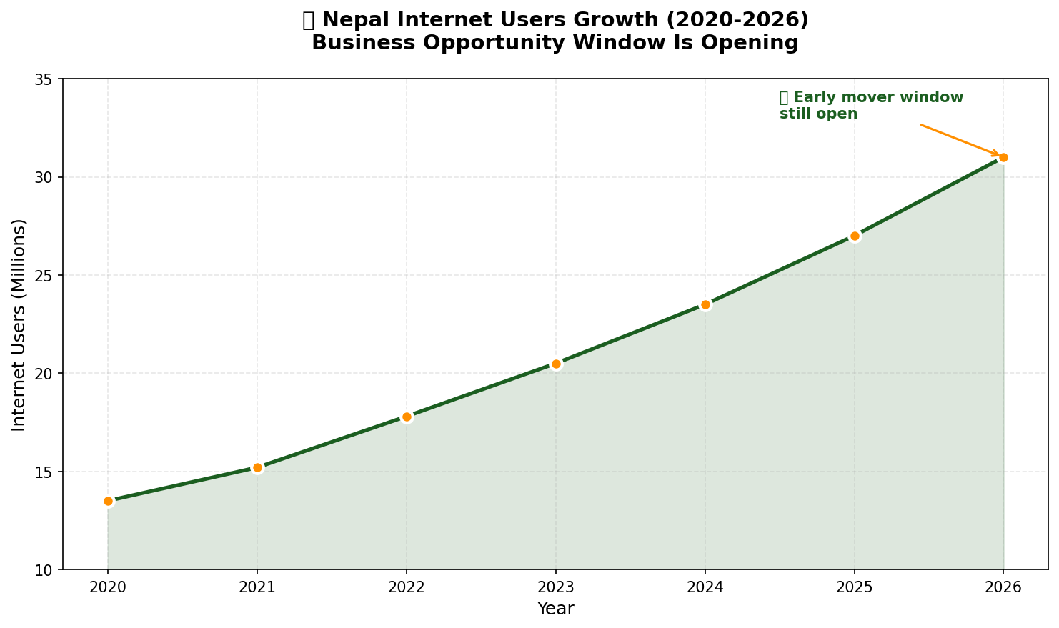 Figure 1: Nepal's Internet Growth (2020-2026). The business opportunity window is still open for early movers.