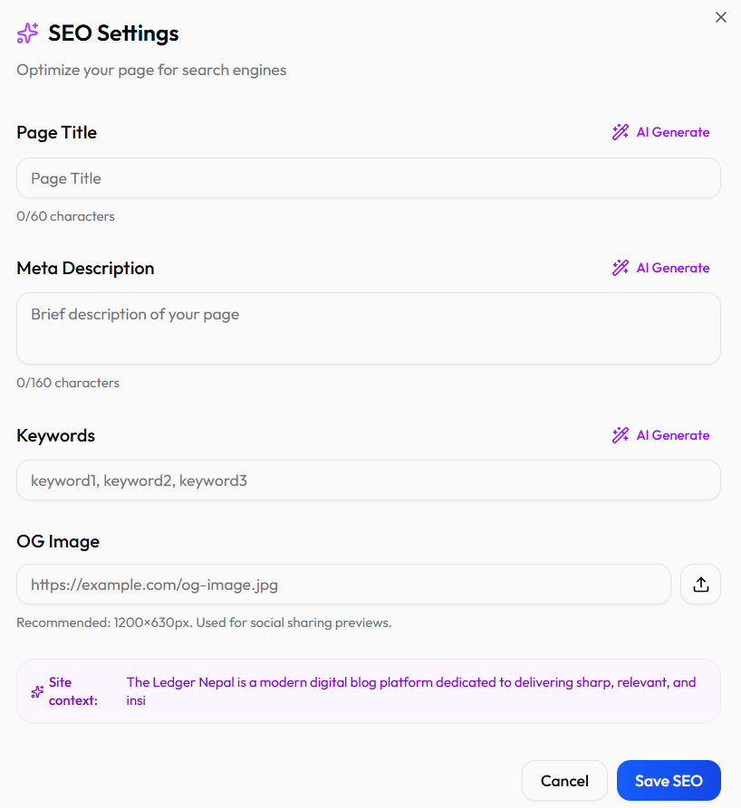 Fig 2: HamroLink को एसईओ एडिटरले स्केमा र मेटा ट्यागहरू बिना कोडिङ आफैं मिलाइदिन्छ।